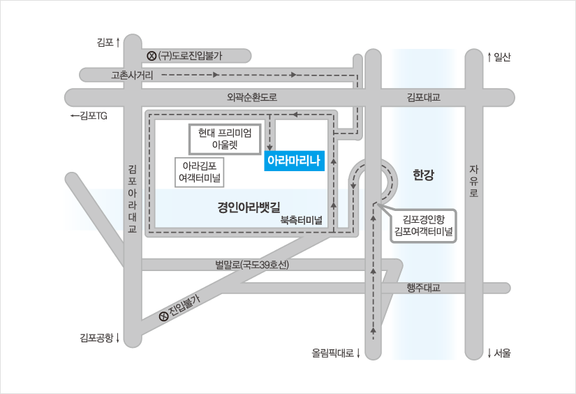 - 서울방향 김포한강로 > 김포터미널 방향 진입 > 화살표 방향 진입