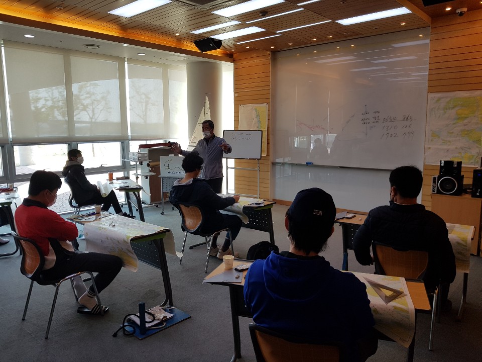 항해 및 기관 파트 해도 수업 장면입니다.