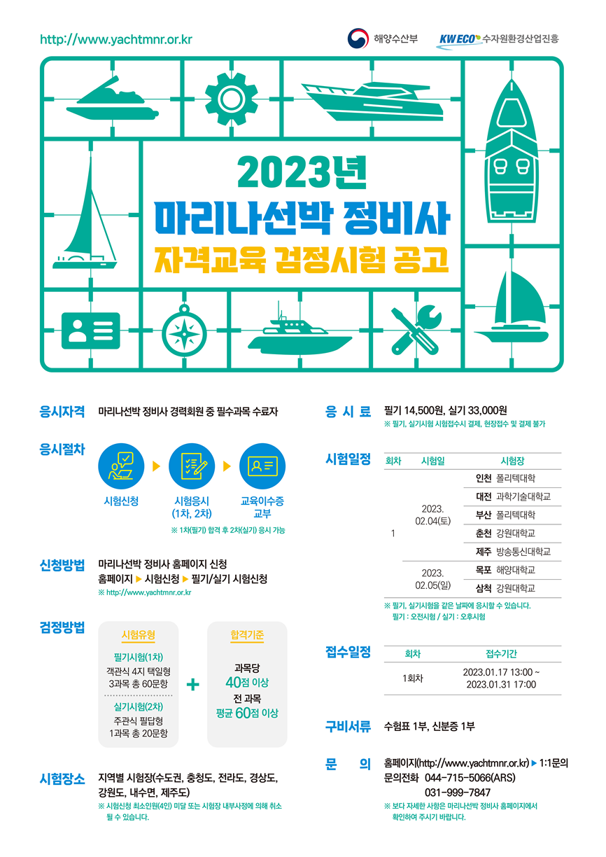 [시험안내] 2023년 마리나선박 정비사 자격교육 검정시험 공고